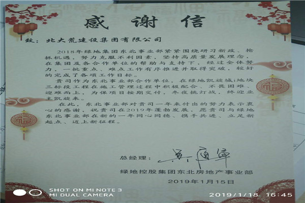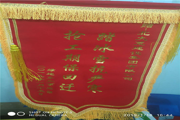 北大荒建設(shè)集團(tuán)有限公司第四分公司承建的綠地凱旋城I地塊三標(biāo)段該項(xiàng)目由綠地地產(chǎn)牡丹江置業(yè)公司開發(fā),建筑面積25600平方米。2018年是關(guān)鍵的一年,在公司領(lǐng)導(dǎo)的帶領(lǐng)下, 項(xiàng)目部全體人員積極配合甲方和相關(guān)單位,不畏困難、迎難而上,為保項(xiàng)目按期交付,冬季踏冰雪抗嚴(yán)寒,確?;剡w戶順利進(jìn)戶。綠地集團(tuán)東北事業(yè)部對(duì)我單位高度認(rèn)可,事業(yè)部總經(jīng)理特發(fā)感謝信并授予我公司榮譽(yù)錦旗。