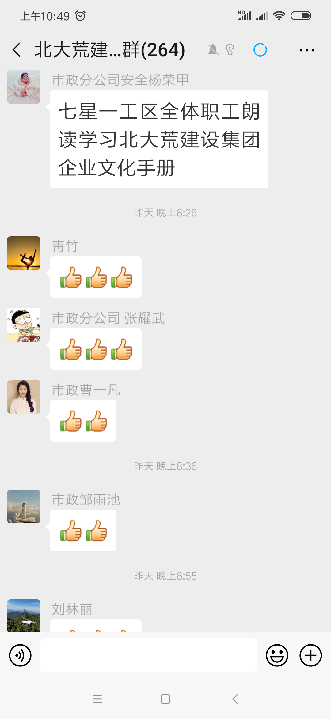 據(jù)一線工作人員告訴筆者,他們是七星一工區(qū)全體職工,晚間休息時間,學(xué)習(xí)是他們的業(yè)余文化生活的一部分,他們充分依托“互聯(lián)網(wǎng)+”“手機(jī)APP+”等手段,觀看了騰訊視頻、百度視頻等時政要聞、會議精神和業(yè)務(wù)學(xué)習(xí)內(nèi)容,個人下載了“學(xué)習(xí)強(qiáng)國”“喜馬拉雅”“懶人聽書”等小軟件幫助學(xué)習(xí),微信群中上傳的視頻就是他們利用“晚課”時間,集中學(xué)習(xí)《黨章》,集中誦讀《企業(yè)文化手冊》內(nèi)容的畫面?!懊刻焱砩纤X之前,翻看一下咱們集團(tuán)的微信公眾號,這是我每天的必修課,有集團(tuán)的新聞,還有理論學(xué)習(xí)知識,還有集團(tuán)總公司的要聞,看一看心里就覺得‘有夢想,就有希望’!”一線工作的小王在微信中告訴筆者。