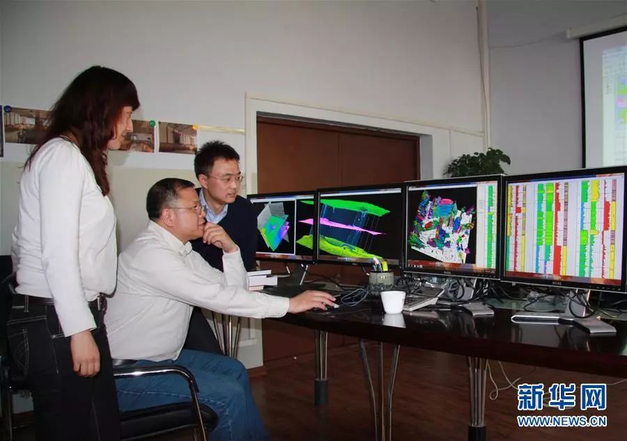 黃大年(中)帶領(lǐng)科研團(tuán)隊(duì)成員研究問題(2010年11月22日攝)。新華社發(fā)