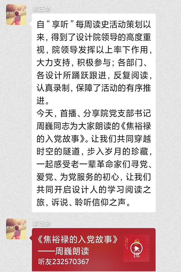 為了加強(qiáng)疫情防控期間廣大黨員干部理論學(xué)習(xí),切實(shí)提高黨員干部理論水平,建筑設(shè)計(jì)院黨支部積極轉(zhuǎn)換思路,策劃“你聽(tīng)我讀、我聽(tīng)你讀”朗讀分享活動(dòng),引導(dǎo)設(shè)計(jì)院全體黨員干部、入黨積極分子、團(tuán)員青年借助喜馬拉雅音頻平臺(tái),共同參與讀史、聽(tīng)史、學(xué)史活動(dòng),在朗讀中尋找思想共鳴,在聆聽(tīng)中收獲思想感悟。
