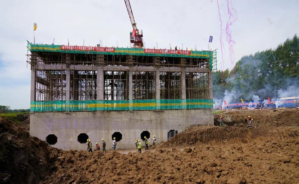 8月23日上午,三江平原青龍山灌區(qū)一期工程中區(qū)工程施工現場鞭炮齊鳴,由水利分公司承建的2020年度黑龍江省三江平原青龍山灌區(qū)一期工程中區(qū)工程中最大的單體建筑物-中南二干提水泵站如期封頂。水利分公司打響了三江平原灌區(qū)工程建設“百日會戰(zhàn)”的第一槍。