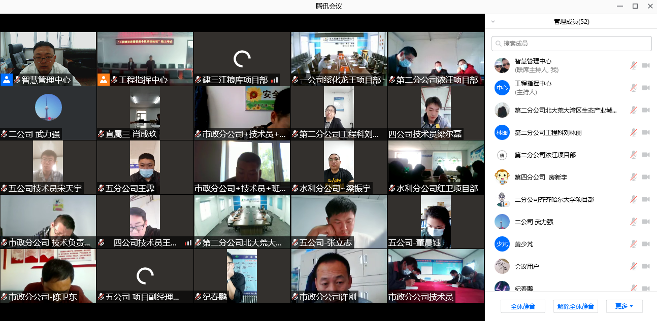 此次考試為閉卷答題,采取總部視頻監(jiān)考方式,在做好疫情防控的前提下,各分公司、項(xiàng)目部共計(jì)99人在相應(yīng)的會議室進(jìn)行答題。參考人員不分職務(wù)及崗位,均以普通考生身份接受測試,嚴(yán)格遵守考場紀(jì)律??荚嚱Y(jié)束后,項(xiàng)目部負(fù)責(zé)人當(dāng)場拍照將答題人的試卷電子版?zhèn)骰毓こ坦芾聿吭u閱。