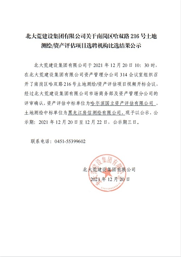 關于哈雙路216號土地測繪和資產評估項目選聘機構比選結果公示