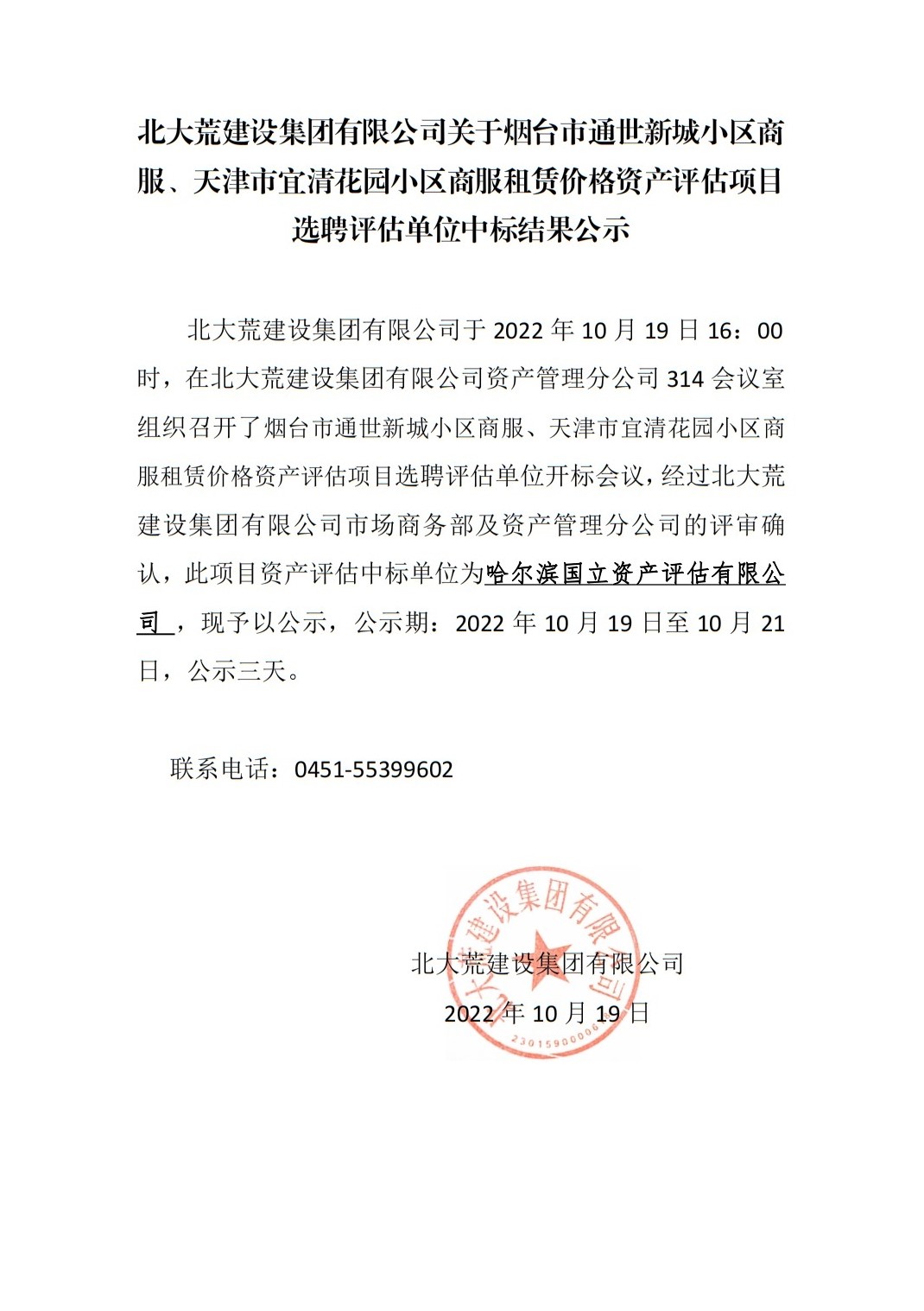 北大荒建設(shè)集團(tuán)有限公司關(guān)于煙臺(tái)市通世新城小區(qū)商服、天津市宜清花園小區(qū)商服租賃價(jià)格資產(chǎn)評(píng)估項(xiàng)目 選聘評(píng)估單位中標(biāo)結(jié)果公示