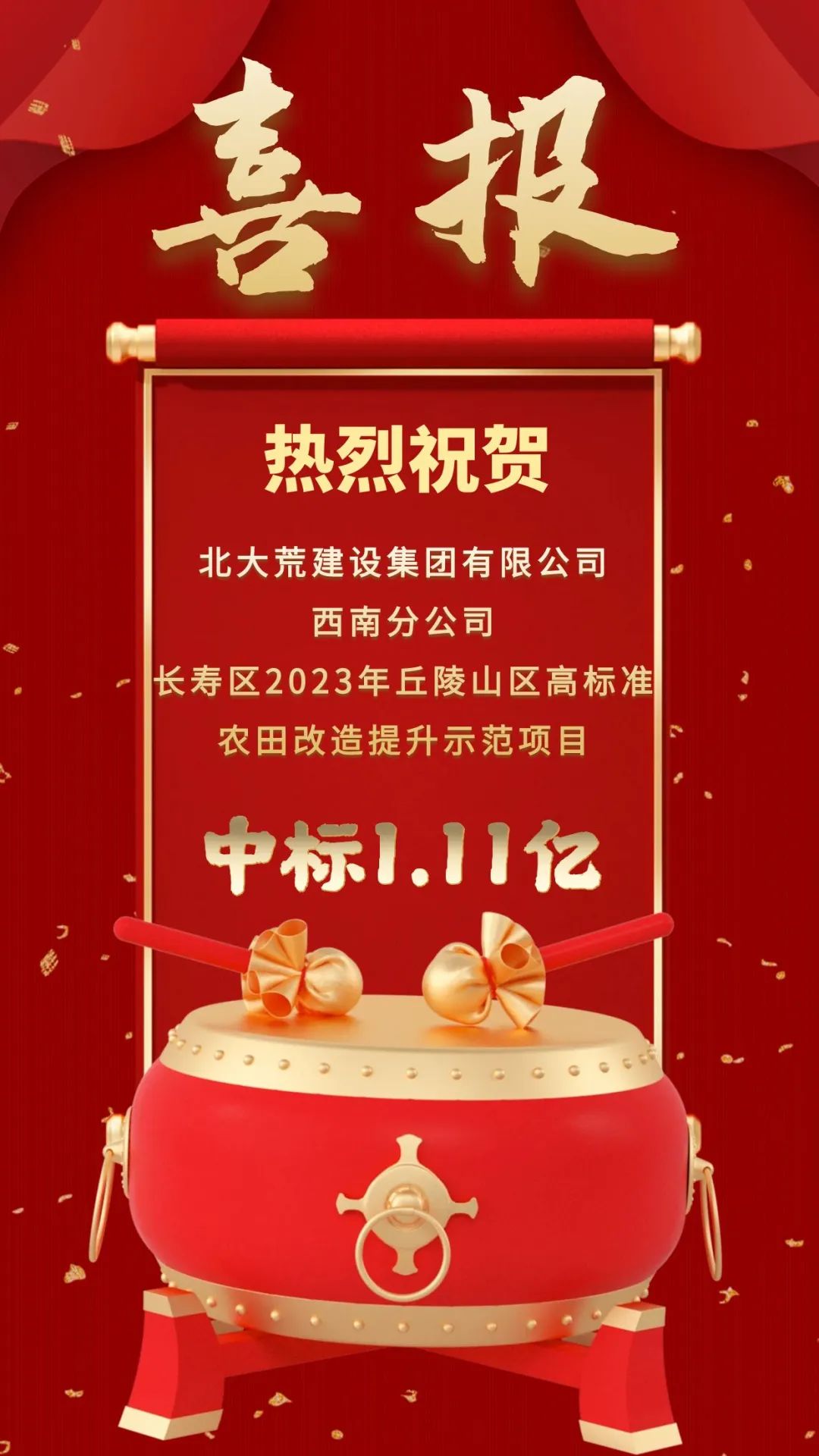 ?喜報!西南分公司中標(biāo)長壽區(qū)2023年丘陵山區(qū)高標(biāo)準(zhǔn)農(nóng)田改造提升示范項目施工+運營,中標(biāo)金額1.11億元